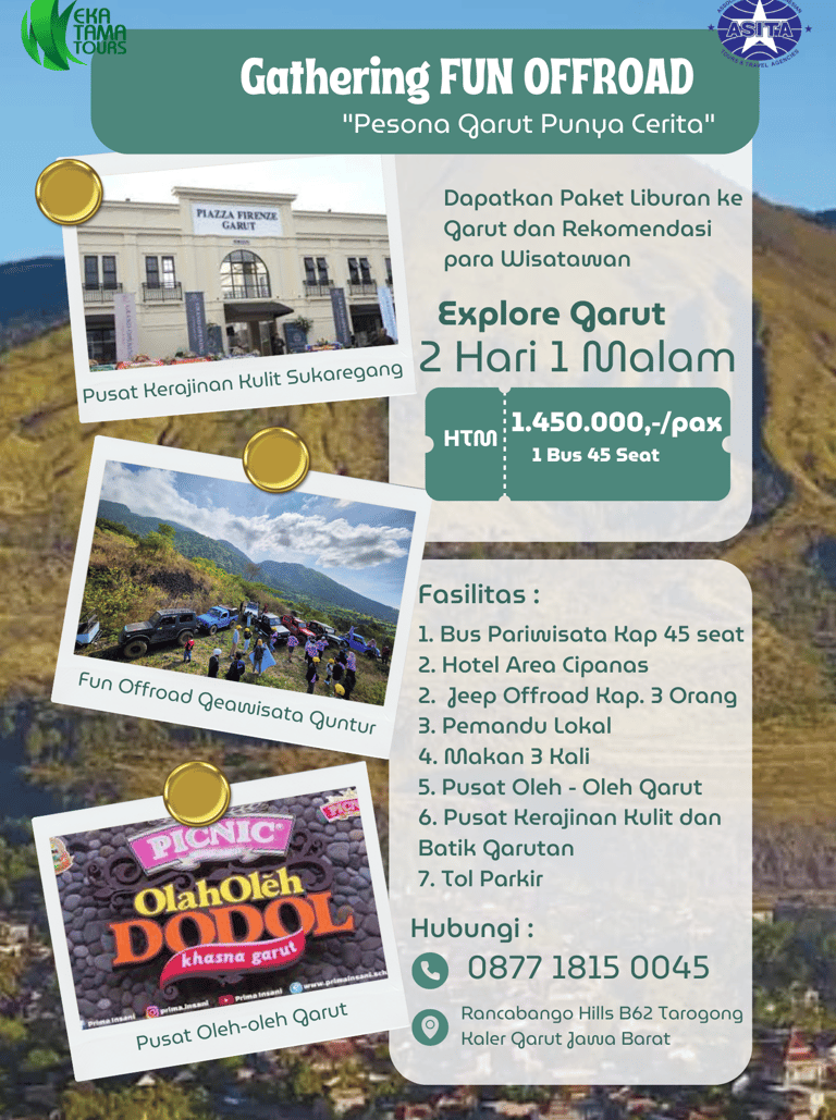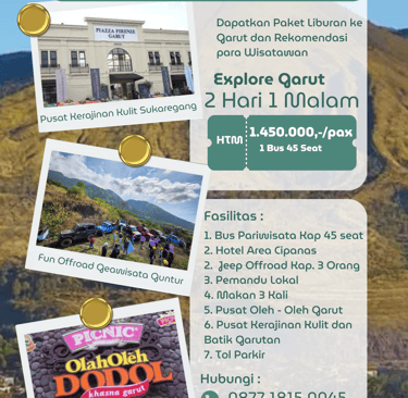 Di bawah ini merupakan paket wisata Garut 2 hari 1 malam yang akan Anda dapatkan. Silahkan hubungi CS kami lebih dahulu untuk mendapatkan harga terbaru